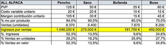 En el cuadro balance anterior se puede observar que debajo de la columna de ingresos por venta existen tres columnas más que descomponen por completo los ingresos por cada producto. Exactamente, se puede ver que porcentaje de los ingresos, de las ventas y del valor real que representa cada producto.