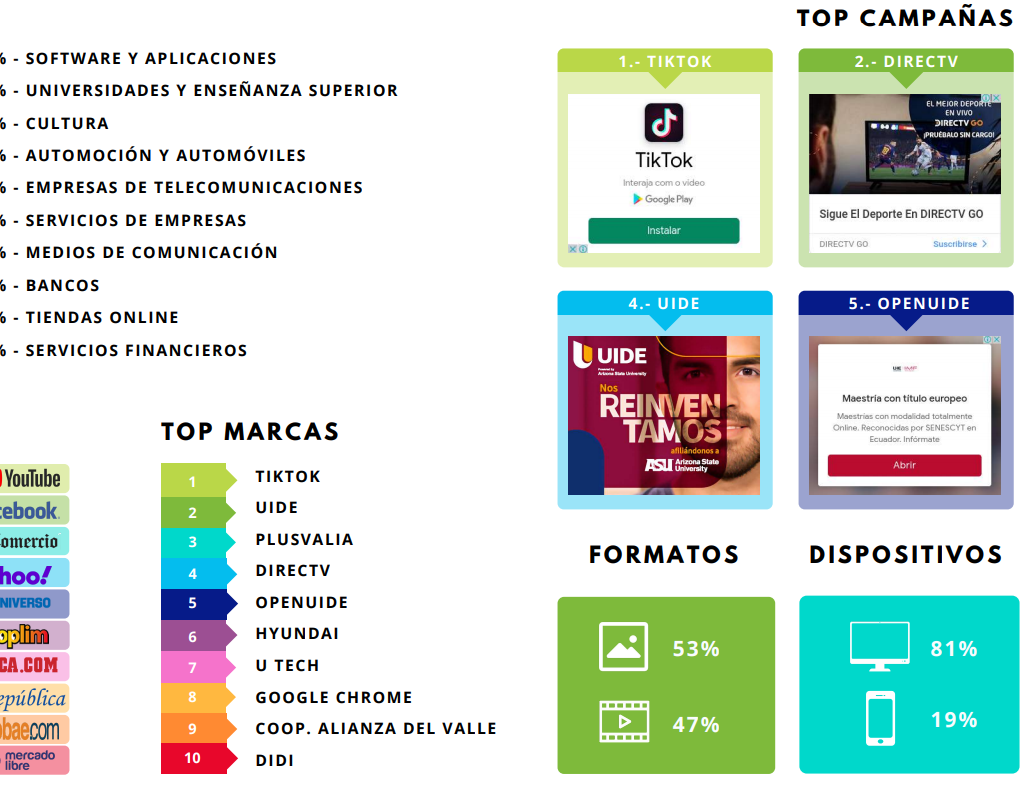 Quienes lideran las campañas online son las industrias de software y aplicaciones, universidad y enseñanza superior y cultura. Ubicándose en el Top 6 de campañas con mayor inversión tenemos a Tiktok, Directv, Hyundai, UIDE, Openuide y Google Chrome. Si bien el formato de imagen predominó en un 53%, youtube fue la plataforma preferida para difundir las piezas publicitarias, siendo los videos un 47% de las preferencias.