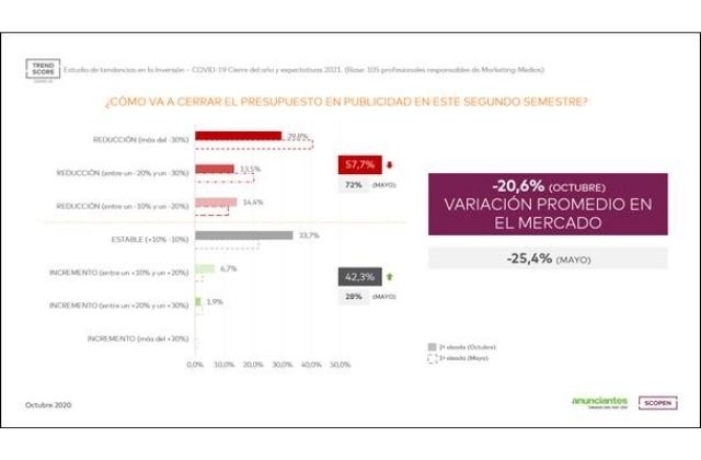 Los anunciantes participantes en la última oleada del 22 Barómetro TREND SCORE y segunda oleada especial Covid-19 muestran una evolución positiva de sus inversiones en este segundo semestre de 2020. Pero un así la variación promedio de la inversión publicitaria cerrará el año con una bajada del 20,6%. Eso sí, el dato es mejor que el descenso de un 25,4% señalado en el primer semestre como consecuencia de la pandemia de Covid-19,