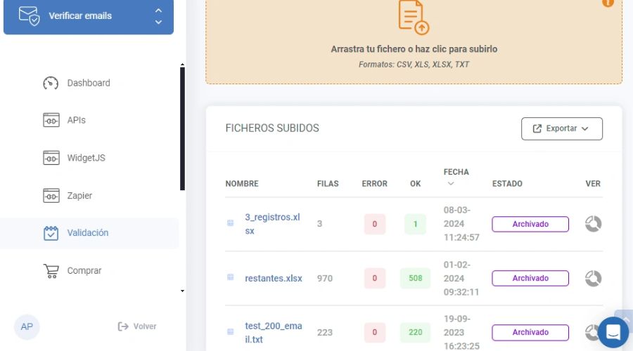 La validación por ficheros te permite cargar archivos CSV, XLS y TXT con hasta 20 columnas en cualquier orden. El sistema procesa el fichero y envía por correo electrónico los resultados detallados en pocos minutos.