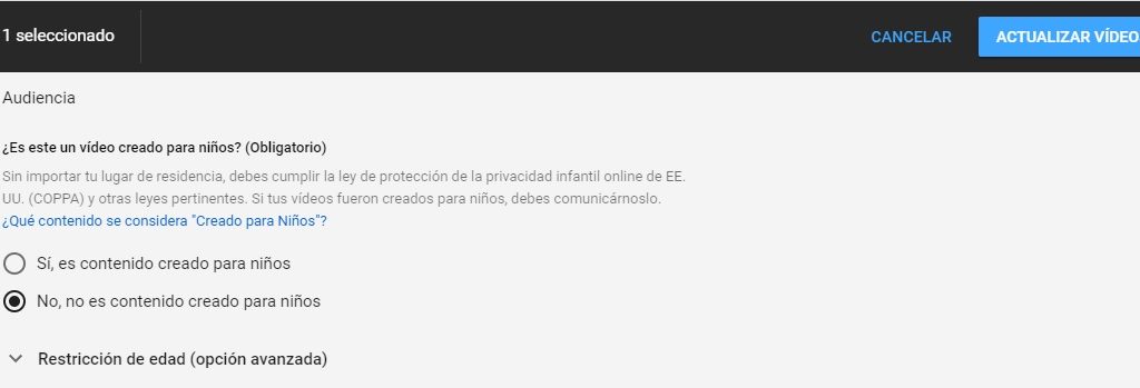 El proceso para configurar la audiencia de todos los vídeos de YouTube y cumplir con la Ley COPPA, tanto del canal completo como de cada vídeo, es el siguiente: