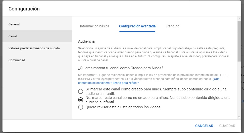 En la ventana que se despliega, hay que hacer clic en la columna de la izquierda en la opción ‘Canal’. De las tres opciones (‘Información básica’, ‘Configuración avanzada’ y ‘Branding’), se selecciona ‘Configuración avanzada’. En este apartado, en la opción ‘Audiencia’, aparecen tres opciones: