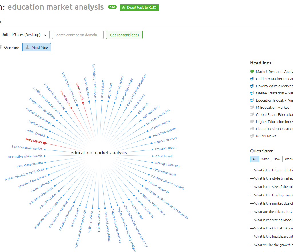 En el ejemplo anterior, puedo ver que ya estoy clasificando frases clave como «análisis de la educación», «datos del mercado de contenido educativo» y «análisis del mercado de la educación». Por lo tanto, voy a seleccionar la frase clave más relevante para mi negocio o mis objetivos de negocio actuales – en mi caso, «análisis de mercado de la educación» – y buscar ideas de contenido relacionadas con la herramienta de Investigación de Temas de SEMrush.