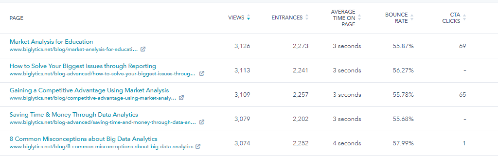 Este informe le permitirá identificar su contenido de mayor rendimiento a través de una variedad de indicadores clave de rendimiento cuantitativos y cualitativos y le proporcionará información sobre la capacidad de todas sus publicaciones para atraer y retener a los visitantes en su sitio web.