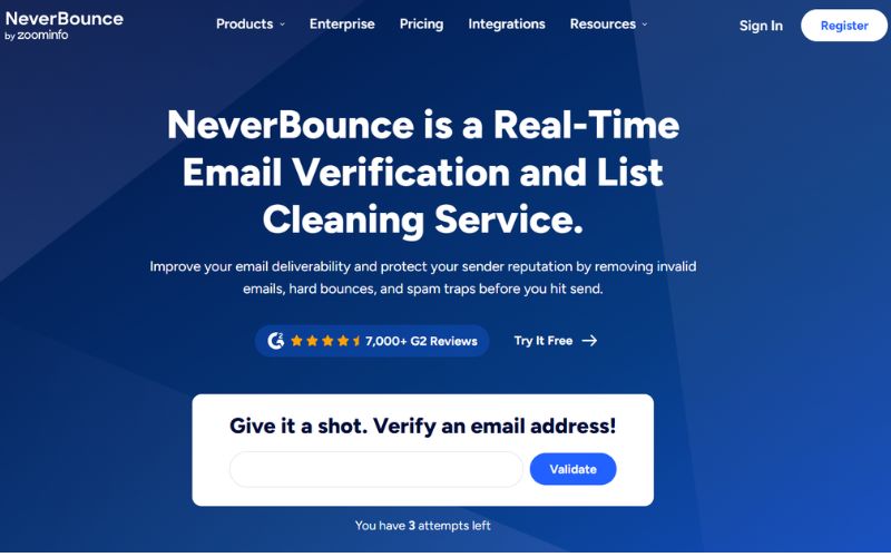 NeverBounce es una solución confiable tanto para grandes verificaciones en masa como para validación en tiempo real a través de API. Esto lo hace especialmente útil para sistemas donde los correos llegan continuamente, como formularios de registro o plataformas SaaS. Su enfoque en prevenir rebotes antes de enviar asegura mayor eficiencia y menores costos de envío.
