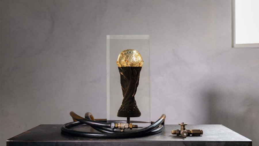 Este reproducción del trofeo, continúa el comunicado de prensa, llega después de que el artista aceptara el reto de la revista Líbero «de crear una obra de arte que denunciase el secuestro del Mundial por parte de los poderes del petróleo a través sobornos a sus dirigentes, según reveló el FBI en 2015 durante una investigación que se saldó con la detención de la mayor parte de los 24 ejecutivos de la FIFA que eligieron a Rusia y a Qatar en 2010 para los Mundiales de 2018 y 2022».