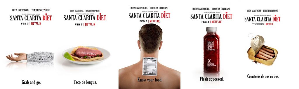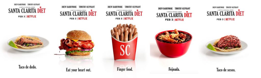 Tras las críticas de la campaña de Narcos, la compañía no titubeó a la hora de lanzar la de Santa Clarita Diet, que podemos considerar como un gran atrevimiento. Podemos destacar todos los carteles que imitan publicidad de comida rápida como la de McDonald’s o Kentucky Fried Chicken (KFC), pero en este caso con porciones del cuerpo humano. Así lo podemos ver en las siguientes fotografías publicadas por Colaborativo.
