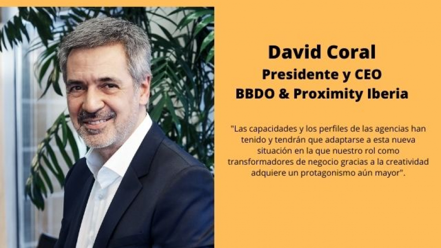 David Coral es presidente y CEO de BBDO & Proximity Iberia desde 2011, aunque su vinculación con la agencia empezó en 2002, y portavoz de la ACT. Además, es Chairman de BBDO University y miembro del board de BBDO WW. Durante sus treinta años de carrera ha coordinado equipos creativos y estratégicos y trabajado con clientes internacionales. El liderazgo, la innovación y la creatividad forman parte de su ADN.